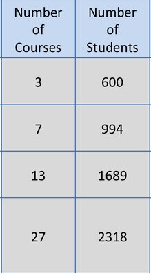 我覺得很驚奇的是,新技術(shù)采納的速度在校園是非常之快的。上圖右側(cè)數(shù)字是2014年春天的時(shí)候,左側(cè)數(shù)字是2013年,前面一列是課程的數(shù)量,后面一列是學(xué)生的數(shù)量,它成長(zhǎng)是非常快的。