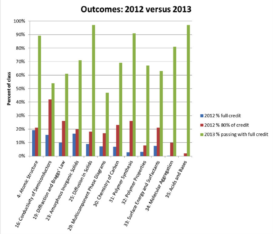 大家看一下上面這個(gè)圖,它的意思是這里有不同的學(xué)科,比如說(shuō)原子結(jié)構(gòu),半導(dǎo)體的導(dǎo)電性,布拉格定率。我們看藍(lán)色和綠色,藍(lán)色是傳統(tǒng)學(xué)習(xí)方式中這些學(xué)生能夠得100分學(xué)員的比例,綠色是用這種新的教學(xué)方式去年能夠得滿分的學(xué)生的比例。