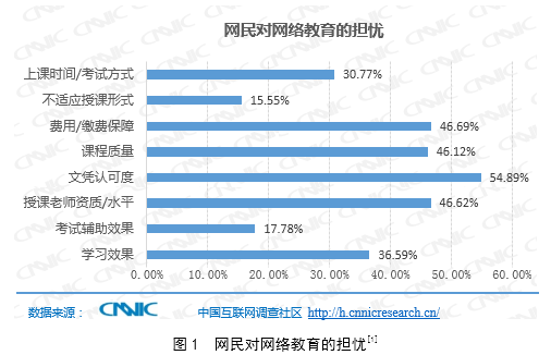 圖1顯示,網(wǎng)民對網(wǎng)絡(luò)教育最大的擔(dān)憂是學(xué)習(xí)后獲得的文憑的被認可度。此外,逾四成被調(diào)查者對繳費保障、課程質(zhì)量、教師授課水平有擔(dān)憂。