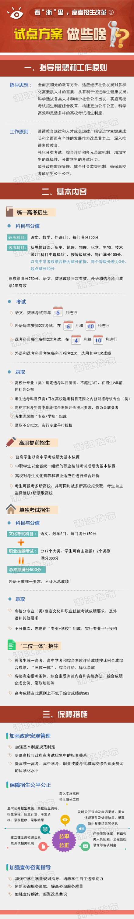 2.確保公平公正公開。把促進公平公正作為改革的基本價值取向。在以考分為依據(jù)的基礎上,實施分類考試、綜合評價、多元錄取,追求更高水平的公平。健全制度機制,切實保障考試招生程序公開、結(jié)果公正、監(jiān)督有力。