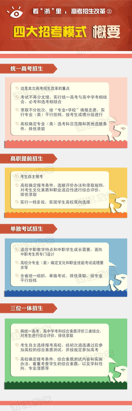 調(diào)整統(tǒng)一高考科目,完善普通高中學業(yè)水平考試制度,建立高中學生綜合素質(zhì)評價制度,形成分類考試、綜合評價、多元錄取、程序透明的高等學校考試招生模式。