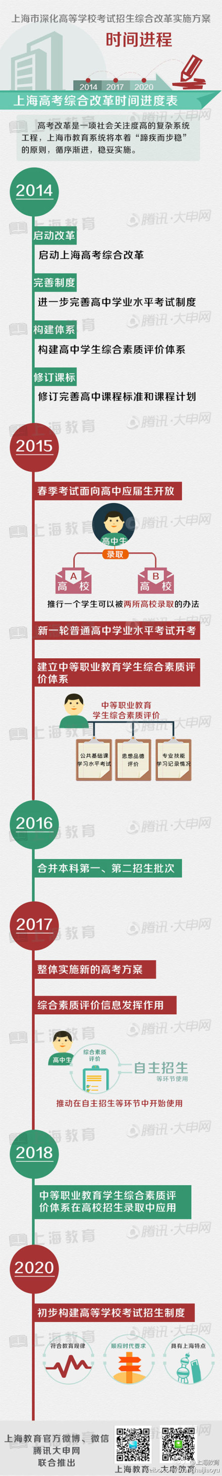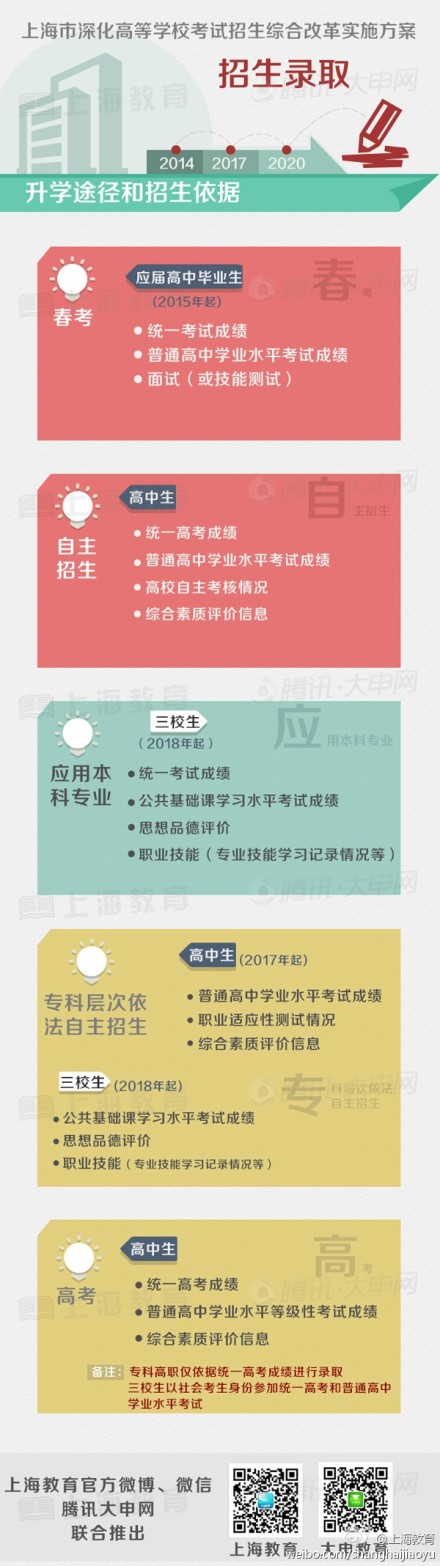 2014年啟動本市高等學??荚囌猩C合改革,2017年整體實施。到2020年,初步建立符合教育規(guī)律、順應時代要求、具有上海特點的高等學??荚囌猩贫?。