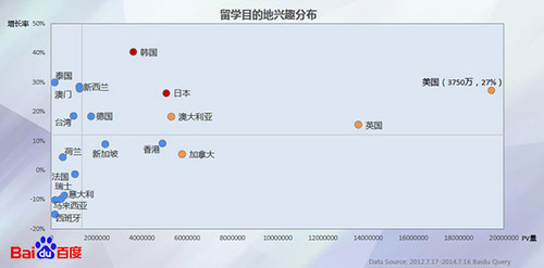 美國(guó):中國(guó)留學(xué)生是美國(guó)院校中所占比例最大的外國(guó)學(xué)生群體,13年人數(shù)比上一年再增加21%。總統(tǒng)奧巴馬稱“要重新設(shè)計(jì)美國(guó)高中”,未來(lái)美國(guó)高中教育發(fā)展的良好趨勢(shì)也將對(duì)國(guó)民有更大吸引力。美國(guó)駐華大使館和所有領(lǐng)事館實(shí)施新的簽證申請(qǐng)系統(tǒng),大大簡(jiǎn)化申請(qǐng)流程。澳洲部分高校開(kāi)始接受中國(guó)高考成績(jī)。兩國(guó)貨幣匯率持續(xù)走低。日本自14年4月起申請(qǐng)不再明確要求日語(yǔ)語(yǔ)言能力,受到政策、日元貶值的影響,赴日留學(xué)生比例逐步加大。