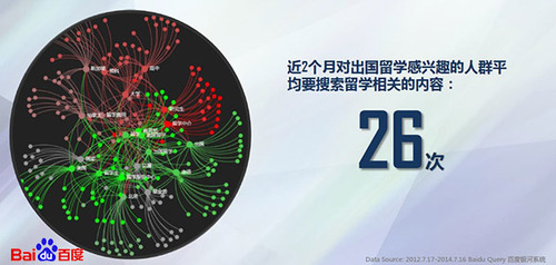 百度目前一年覆蓋留學(xué)興趣人群近500萬(wàn),產(chǎn)生約3.6億次的留學(xué)相關(guān)檢索。