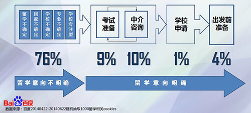 當(dāng)留學(xué)意向明確之后,在網(wǎng)上的檢索將更加明晰化結(jié)構(gòu)化。整體分為:考試準(zhǔn)備、中介咨詢或兩者并行、學(xué)校申請(qǐng)。后端行為即出發(fā)前準(zhǔn)備,網(wǎng)民多檢索諸如學(xué)校宿舍、學(xué)校周邊生活信息、兩國(guó)貨幣匯率差、機(jī)票、保險(xiǎn)等相關(guān)信息。