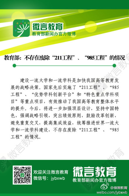 從本周開(kāi)始,一則教育部已經(jīng)廢除高?!?85工程”以及“211工程”的消息開(kāi)始在網(wǎng)絡(luò)上熱傳。昨日晚間,教育部通過(guò)微博平臺(tái)“微言教育”正式辟謠:不存在廢除“985工程”“211工程”的情況。