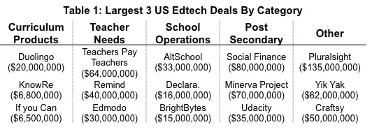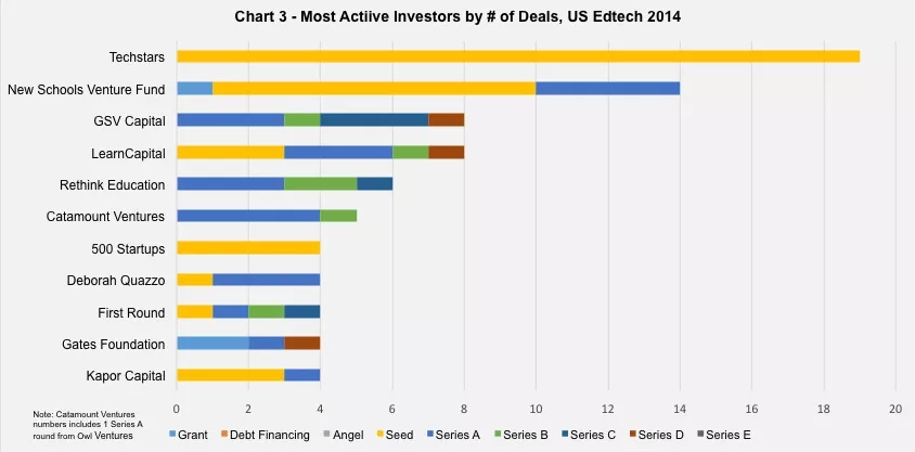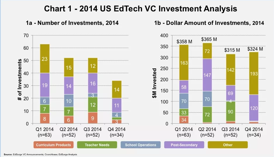 通過上面這個圖表可見的趨勢是,雖然今年從 Q1-Q4,獲得融資的教育科技公司數(shù)量是在逐漸減少的,但是投資總量卻基本持平,也就是下半年更多的資金投入到了數(shù)量更少的公司里。