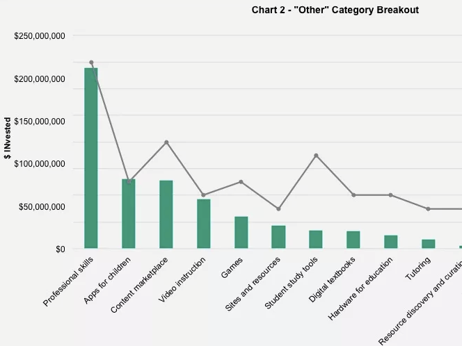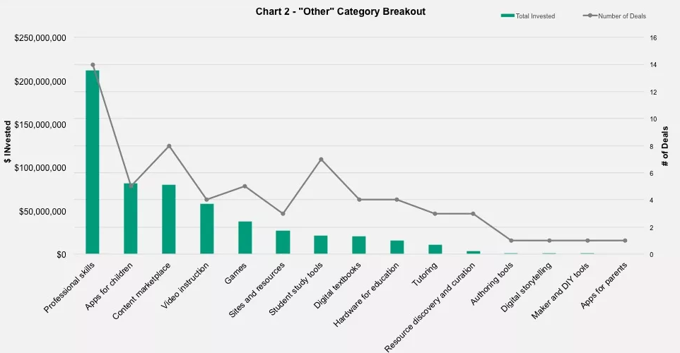 再來看 Other/ 其他類部分。如下表所示,其他類中包含了職業(yè)技能培訓(xùn)、幼教 app、內(nèi)容產(chǎn)品、視頻教學(xué)產(chǎn)品、游戲、學(xué)習(xí)工具等等類別的產(chǎn)品。其中職業(yè)技能類所獲投資占比最大,總金額超過 2 億美金,為父母開發(fā)的 app 則占投資總額比例最小。