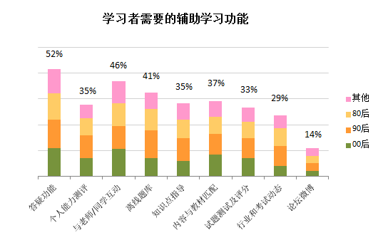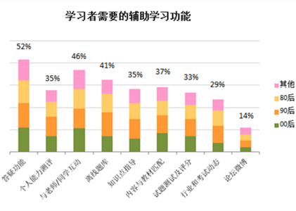 騰訊精品課《2014年中國在線學(xué)習(xí)用戶行為調(diào)查》發(fā)現(xiàn),在線教育產(chǎn)品輔助學(xué)習(xí)功能中,最受期待的是答疑和互動(dòng)功能的實(shí)現(xiàn),00后用戶對此的需求尤為明顯,但目前的平臺還不能很好地解決這一點(diǎn)。