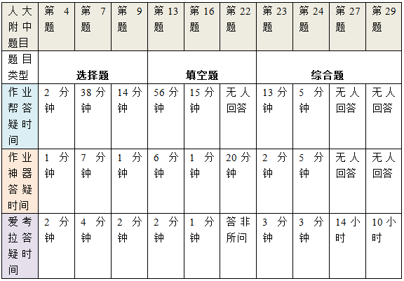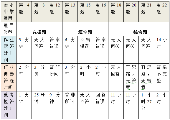 人工答疑測評方式為:在同一時間,選擇同樣題目的情況下,比較三款軟件的答疑時間和答疑準(zhǔn)確率。