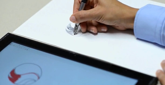 使用這項技術,用戶在使用配套的電子筆在普通紙張上繪制自己想要的圖案或是書寫文字內(nèi)容時,放置在一旁的驍龍805原型平板會通過手寫筆所發(fā)出的聲音來同步判斷用戶的筆尖軌跡,并在屏幕中顯示出完全相同的圖案和文字,而平板內(nèi)置的繪圖應用還允許用戶對著色、筆觸進行選擇。