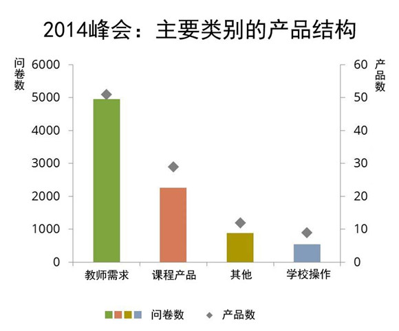 以下是基于6次峰會的反饋信息總結(jié)出的觀點。下面的圖表顯示,在2014年6次All Educator Days上,EdSurge根據(jù)Edtech Index的分類確定了產(chǎn)品類型。