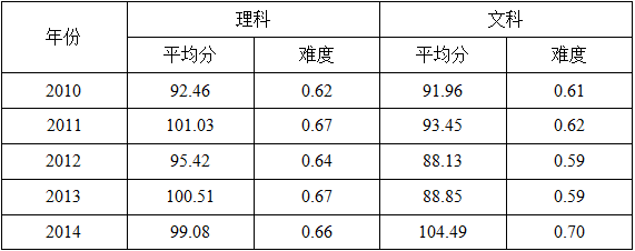 從表中可以看出,北京市高考數(shù)學(xué)平均分變化整體比較平穩(wěn),其中理科數(shù)學(xué)13至14年平均分基本持平。