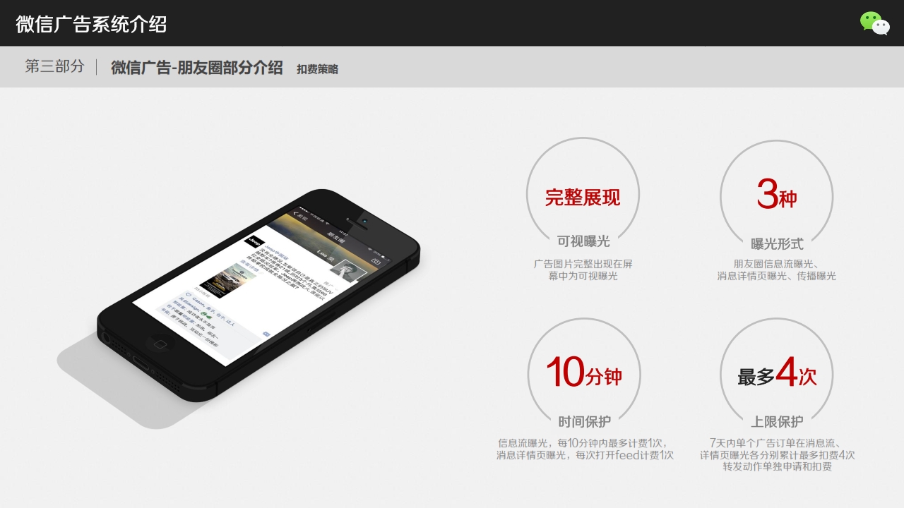 昨日,微信正式內(nèi)測朋友圈廣告。今天,一套關(guān)于微信朋友圈廣告系統(tǒng)的詳細(xì)介紹的PPT流傳開來。在這套PPT里,騰訊介紹了目前微信用戶數(shù),微信朋友圈中的廣告形態(tài),收費(fèi)方式,曝光策略,扣費(fèi)策略,售賣策略。