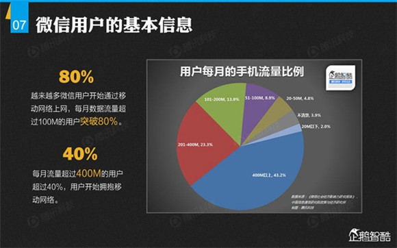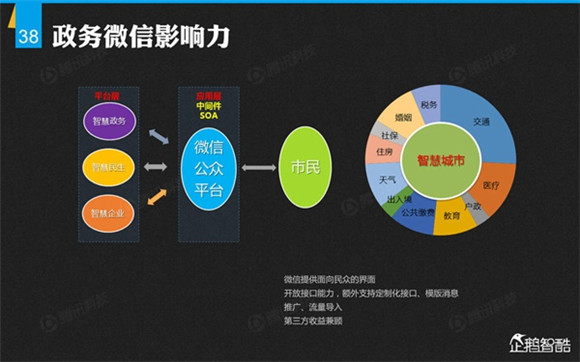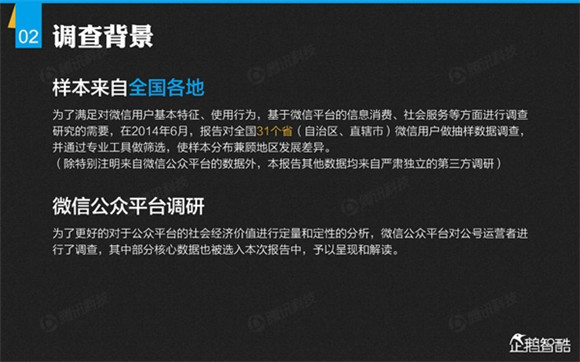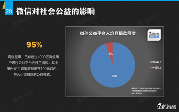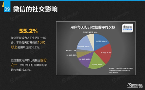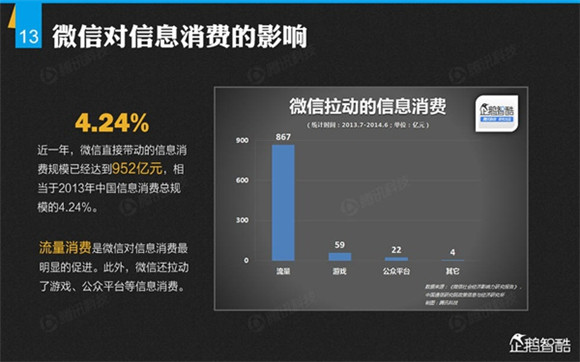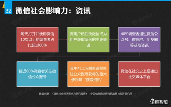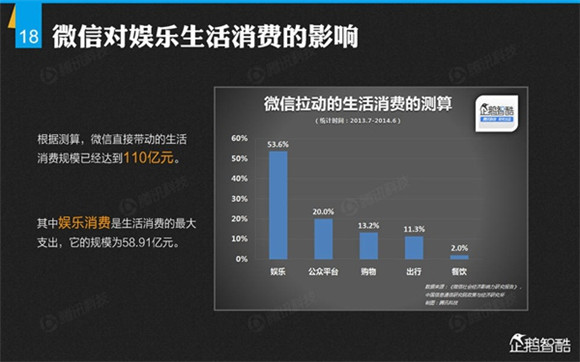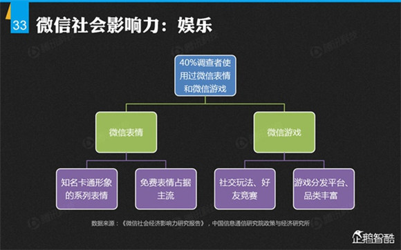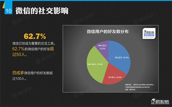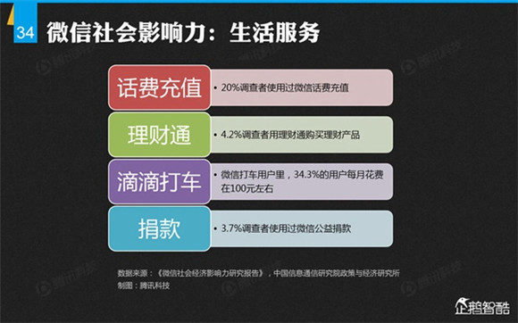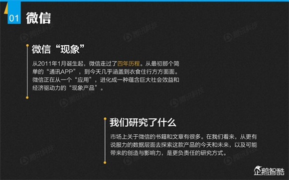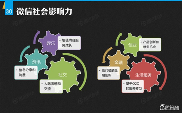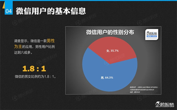微信誕生4年后,騰訊出品了首份微信平臺(tái)數(shù)據(jù)化報(bào)告,就微信用戶的基本信息、微信的社交影響、微信對(duì)信息消費(fèi)的影響、微信對(duì)娛樂和生活消費(fèi)的影響、微信公眾平臺(tái)的影響力、微信對(duì)社會(huì)就業(yè)的影響、微信對(duì)社會(huì)公益的影響、其整體影響力等方面做了調(diào)查研究。