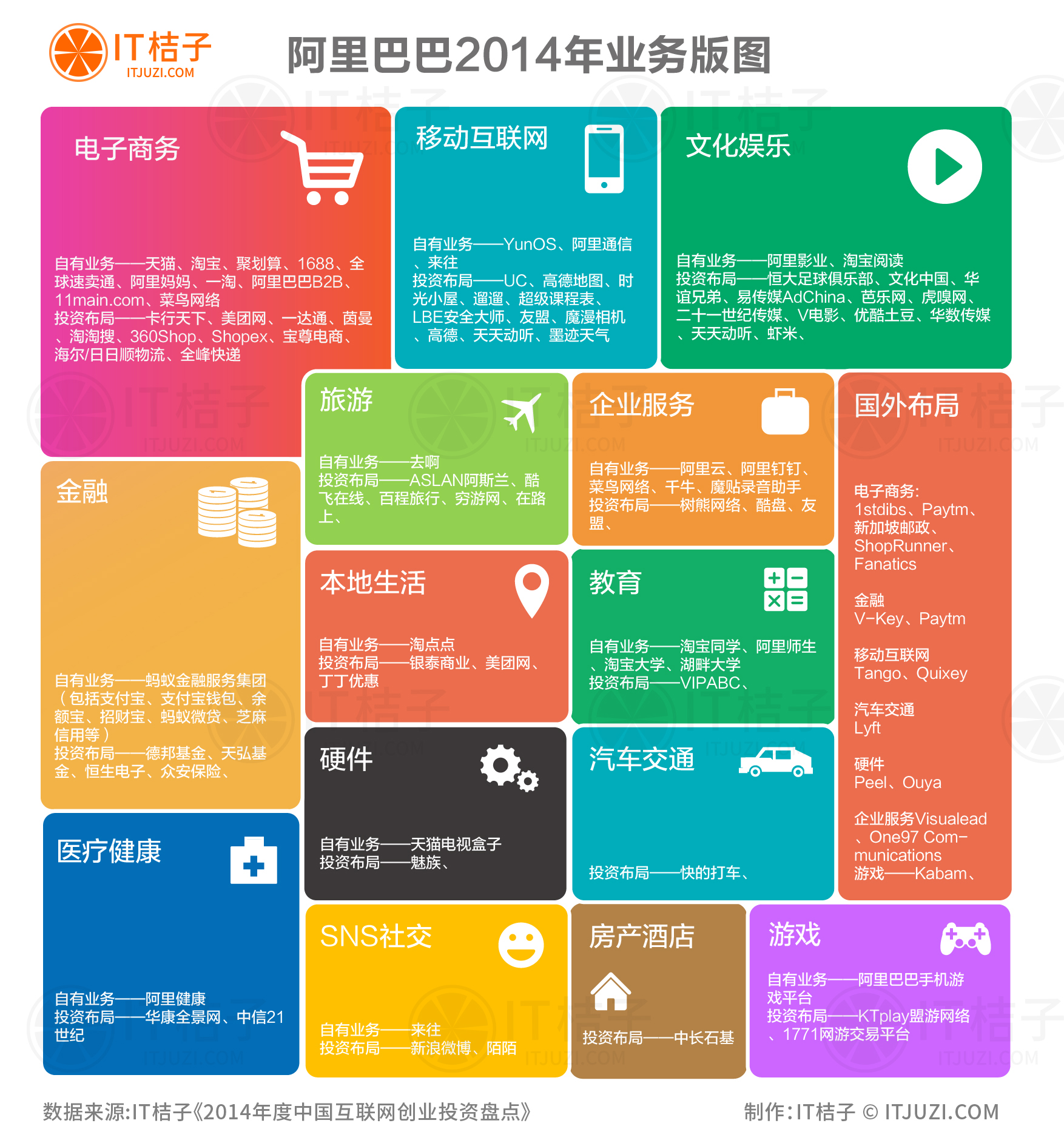 基于上述分析,結(jié)合IT桔子數(shù)據(jù)庫,我們來大致盤點(diǎn)一下阿里巴巴2014年都在哪些方面進(jìn)行了新的布局。