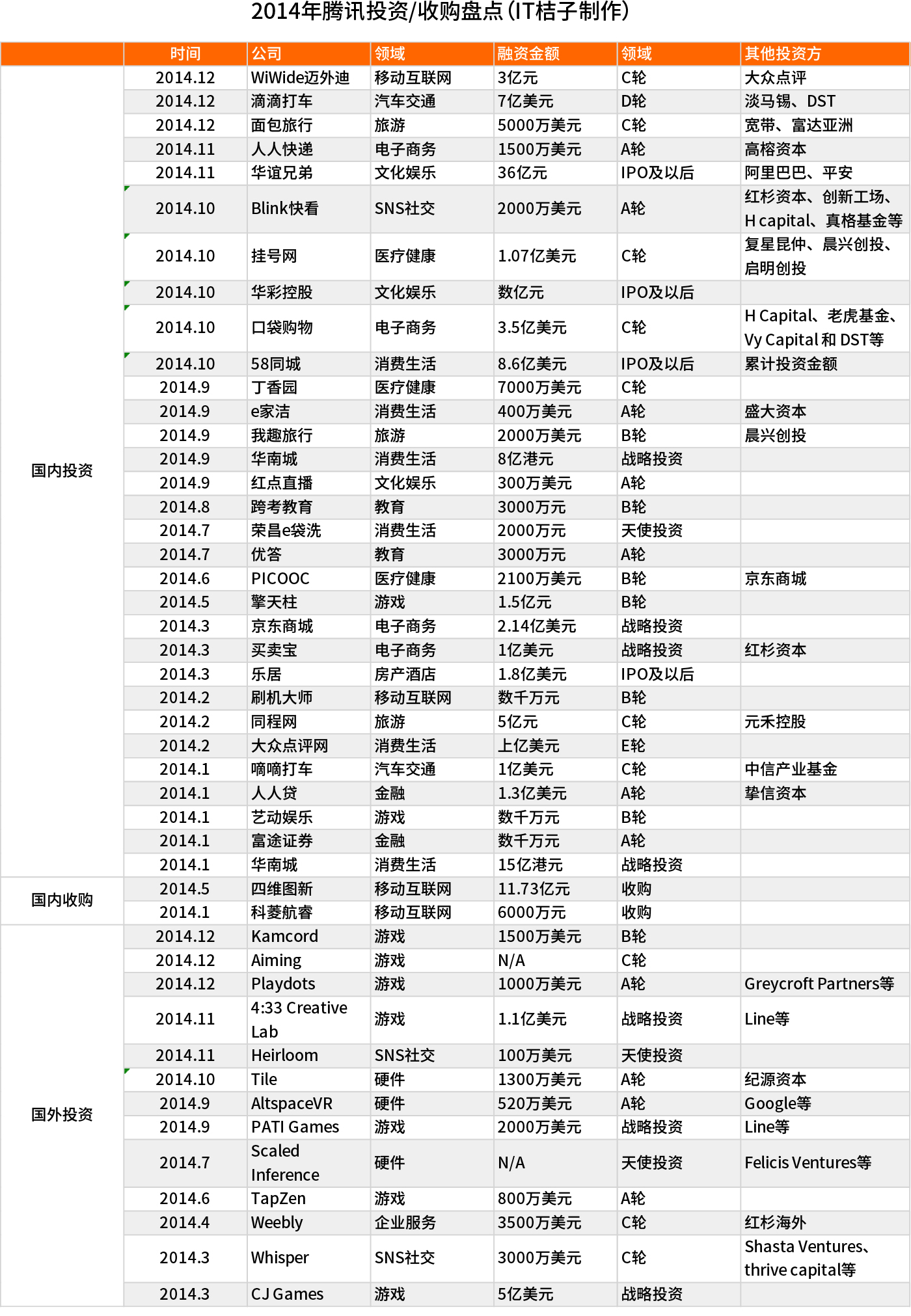 IT桔子數(shù)據(jù)庫中,2014年騰訊所投資或收購的公司超過46起,根據(jù)公開金額的投資粗略估算達(dá)到70億美元。