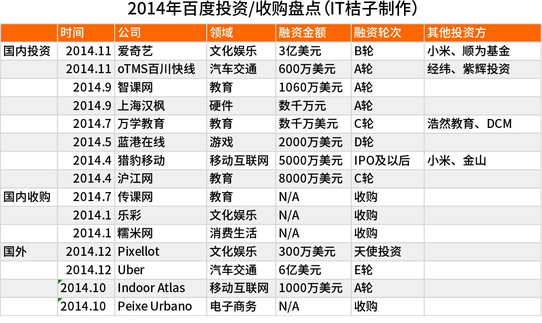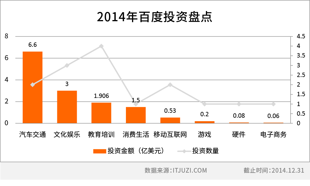 來自IT桔子的數(shù)據(jù)庫顯示,2014年百度的投資和收購僅有15起,是幾家巨頭中最為謹(jǐn)慎的一家,而且投資的方向也不太多,主要集中在企業(yè)、文化娛樂、教育等領(lǐng)域,電子商務(wù)、游戲、硬件都在探索的方向。投資金額上也不是太多,粗略估算有近15億美元,而且其中有6億美元就投向了Uber,大多數(shù)投資都在比較小的數(shù)量級,可能更傾向于內(nèi)部探索。
