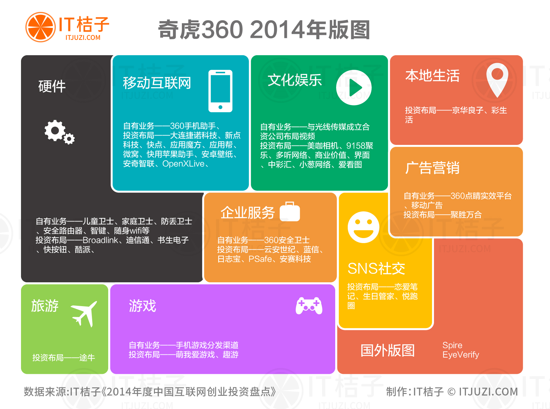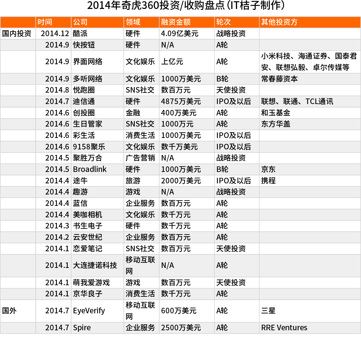 來自IT桔子的數(shù)據(jù)庫顯示,2014年奇虎360的投資和收購有24起,從所披露的投資金額估算年度投資額近7億美元,主要集中在企業(yè)(安全)、 硬件、文化娛樂、移動(dòng)互聯(lián)網(wǎng)等方向,資金分布上也基本上一致。和其他幾家公司不一樣的是,奇虎360在2014年的投資案例中有4起是作為公司IPO前的基石投資者來入股的,不知道是基于戰(zhàn)略合作、還是財(cái)務(wù)投資。