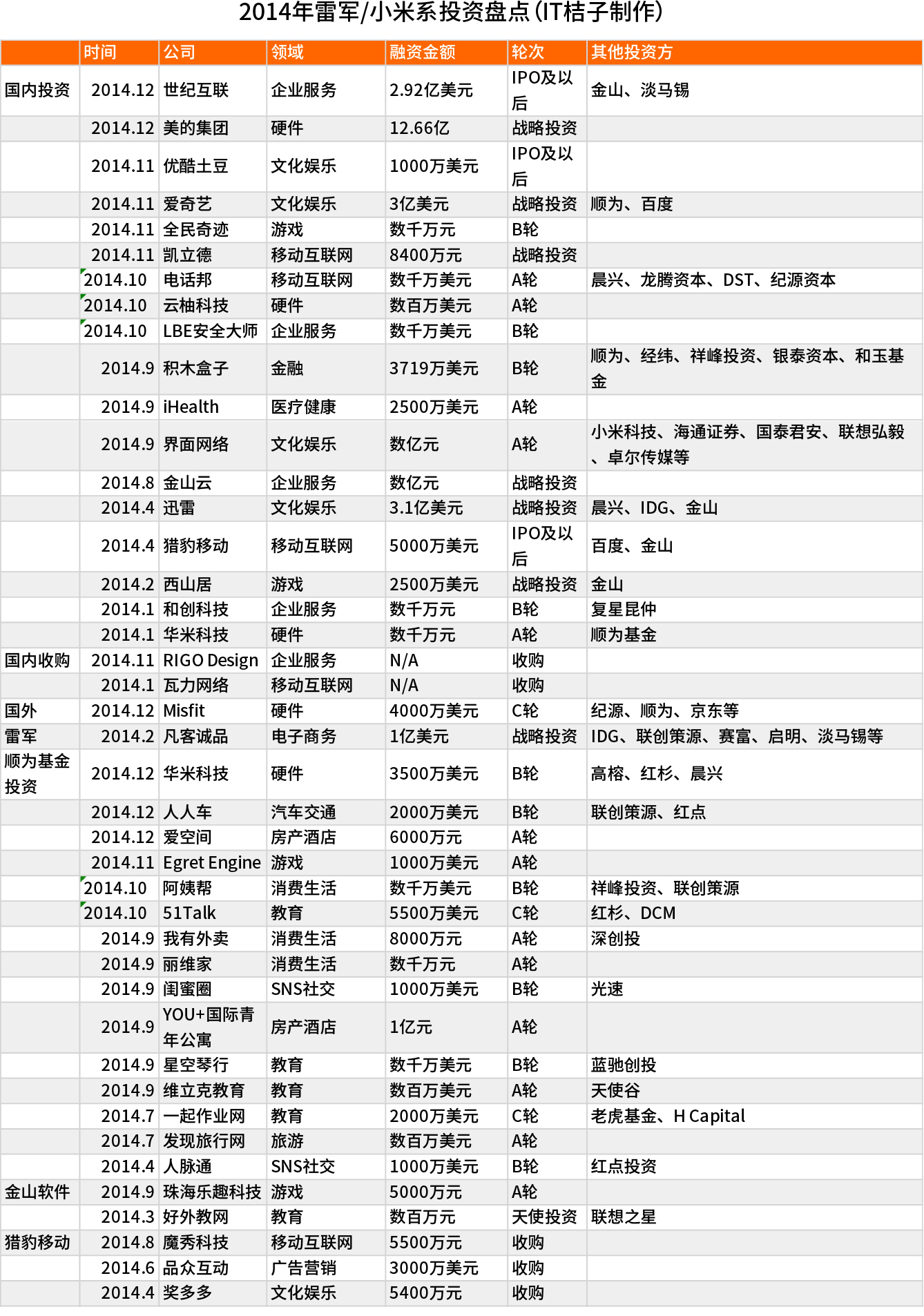 來自IT桔子的數(shù)據(jù)庫顯示,包括小米、金山、順為、獵豹在內(nèi)的各個(gè)雷軍系生態(tài)鏈投資和并購的公司有42起,金額近32億美元,比較多的數(shù)量、金額也都很大。