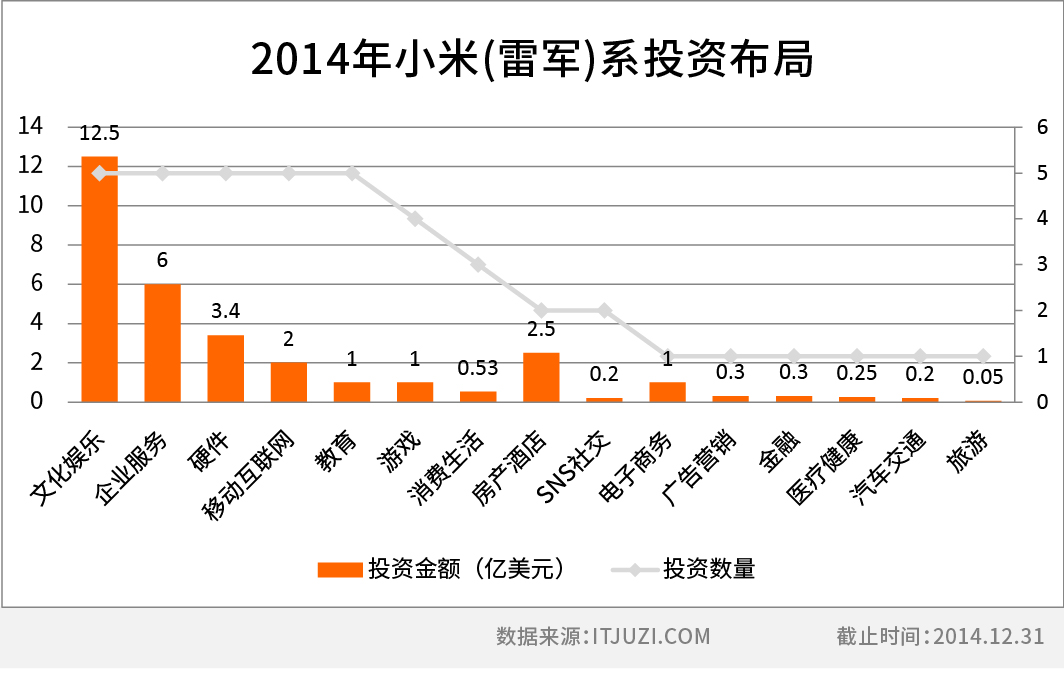 整個(gè)小米系2014年的投資所覆蓋的行業(yè)比較多,就小米而言,在2014年重要的投資在兩個(gè)方向,一個(gè)是硬件、一個(gè)是文化娛樂。在硬件上,小米的投資比較大,最重要的部署是12.66億元戰(zhàn)略投資美的集團(tuán),對其智能家居業(yè)務(wù)做了重要的鋪墊,其他的投資則包括華米科技、Misfit、云柚科技、iHealth等;文化娛樂則是重點(diǎn)在補(bǔ)充內(nèi)容的短板,小米在這方面的投資金額非常大,包括愛奇藝、優(yōu)酷土豆、迅雷、界面網(wǎng)絡(luò)等,重點(diǎn)圍繞視頻內(nèi)容進(jìn)行布局。