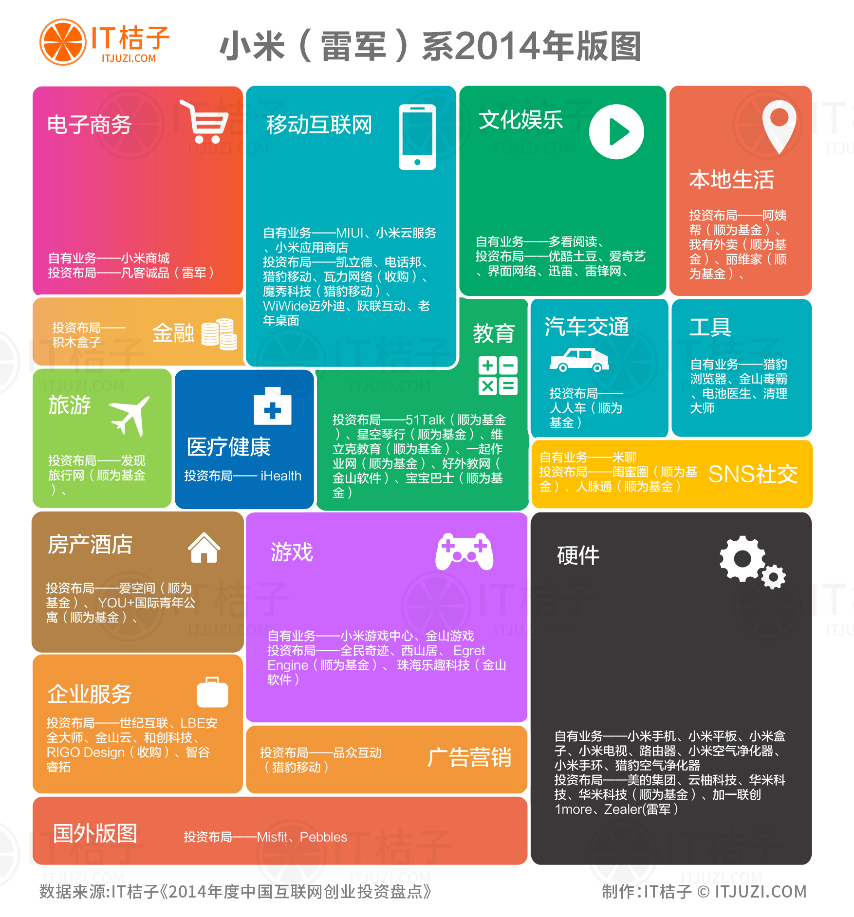 2014年是小米快速發(fā)展和擴(kuò)張的一年,業(yè)務(wù)上也從此前的手機(jī)、數(shù)碼擴(kuò)展到智能家居、醫(yī)療健康等多個(gè)領(lǐng)域,對于創(chuàng)始人雷軍而言,更重要的是生態(tài)系統(tǒng)的建設(shè),與此前盤點(diǎn)單一公司不同,在這個(gè)部分,我們更愿意把這個(gè)派系稱為雷軍系,他已經(jīng)圍繞小米、金山、順為、獵豹移動(dòng)等構(gòu)建了一個(gè)非常龐大的生態(tài)鏈,無論是在自有業(yè)務(wù)、還是投資上都上線了跨越式發(fā)展。