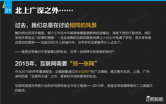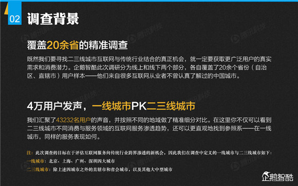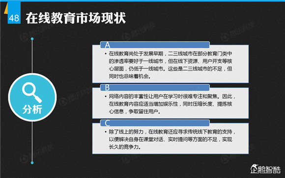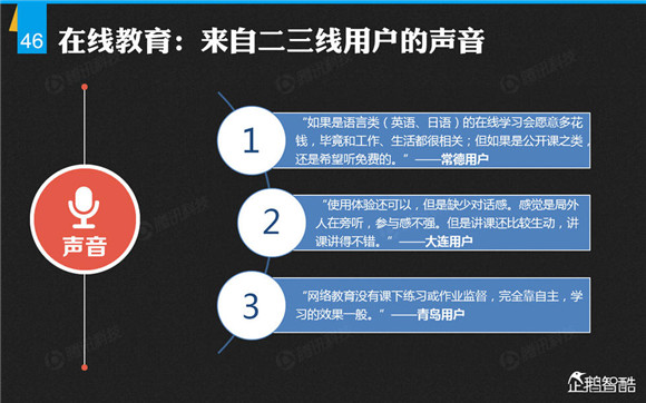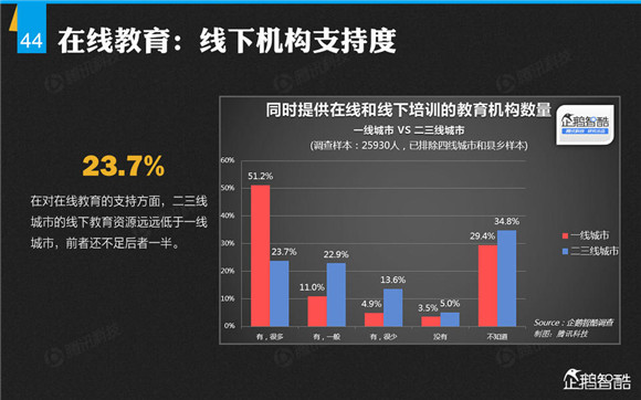 今日,騰訊科技企鵝智庫發(fā)布2015年中國二三線城市互聯(lián)網(wǎng)跨界報告,報告顯示,中國二三線城市半數(shù)左右作用用戶尚未接觸過在線教育,但是隨著網(wǎng)絡普及,城市之間教育差距正在縮短。
