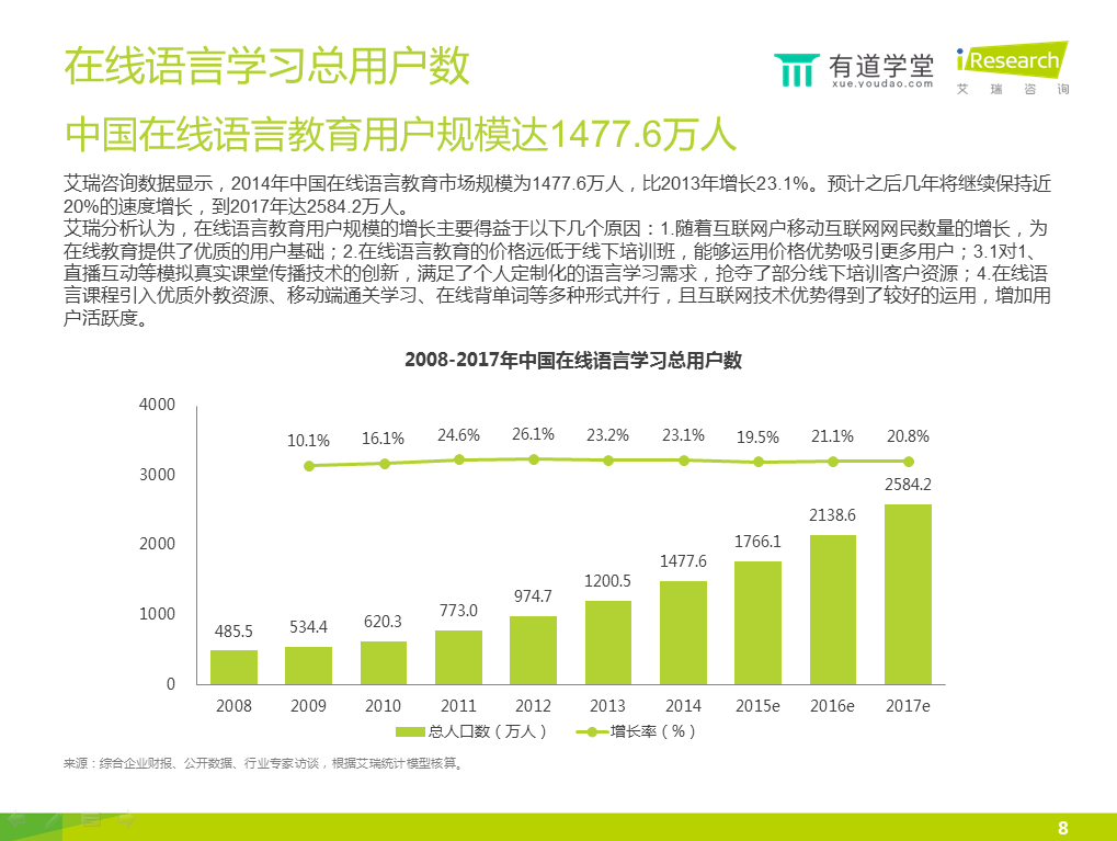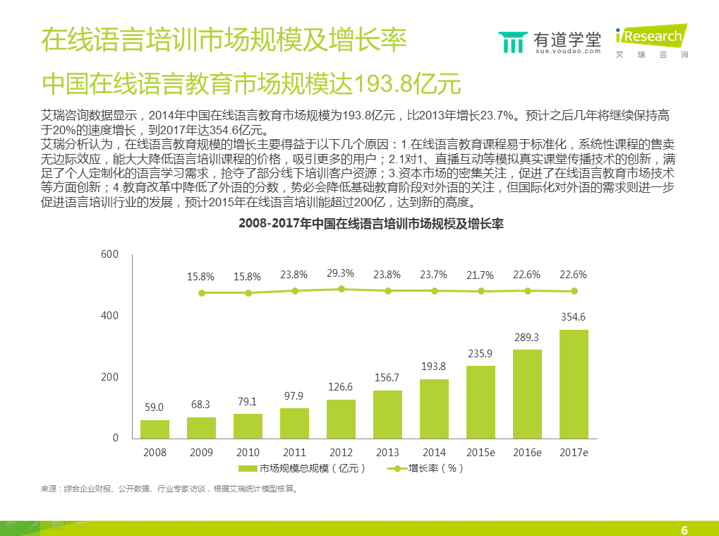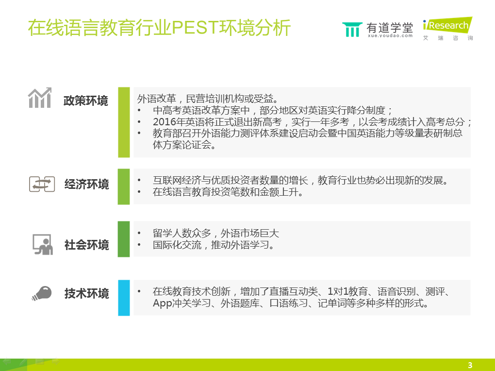 今日,網(wǎng)易有道學(xué)堂與艾瑞咨詢聯(lián)合發(fā)布了一份在線教育語言培訓(xùn)報告,涵蓋了行業(yè)發(fā)展?fàn)顩r、用戶行為觀察、產(chǎn)品分析、未來發(fā)展趨勢等方面。以下為報告部分內(nèi)容: