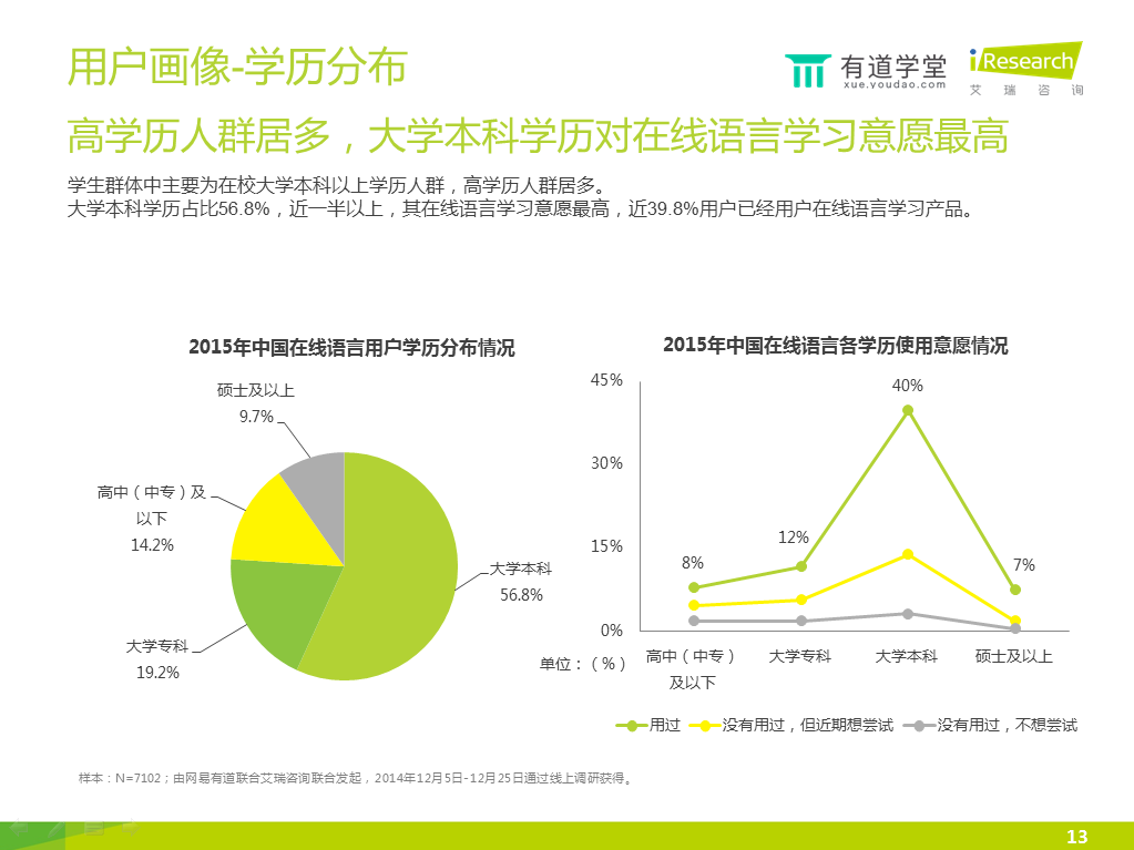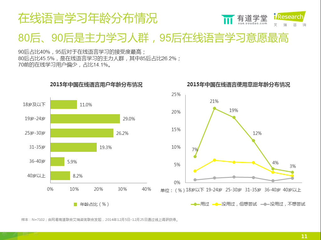2)80后、90后是在線語言學(xué)習(xí)主力人群,95后學(xué)習(xí)意愿最高。