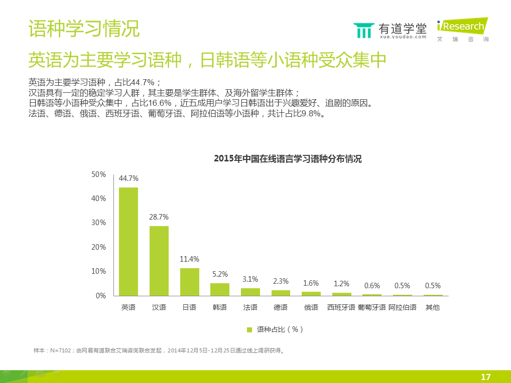 4)英、日、韓、法是四大主要學(xué)習(xí)語種,其中英語占比44.7%。