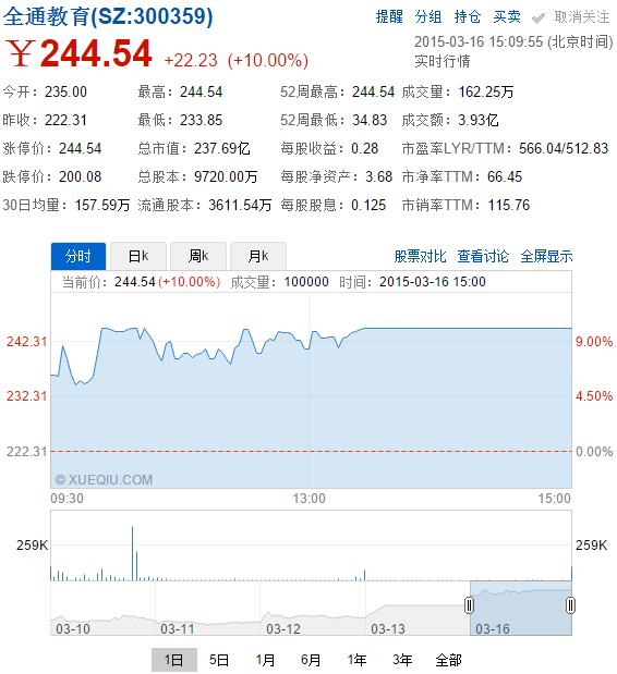 備受關(guān)注的全通教育今日開盤價235元,漲停價244.54元,總市值237.69億元。