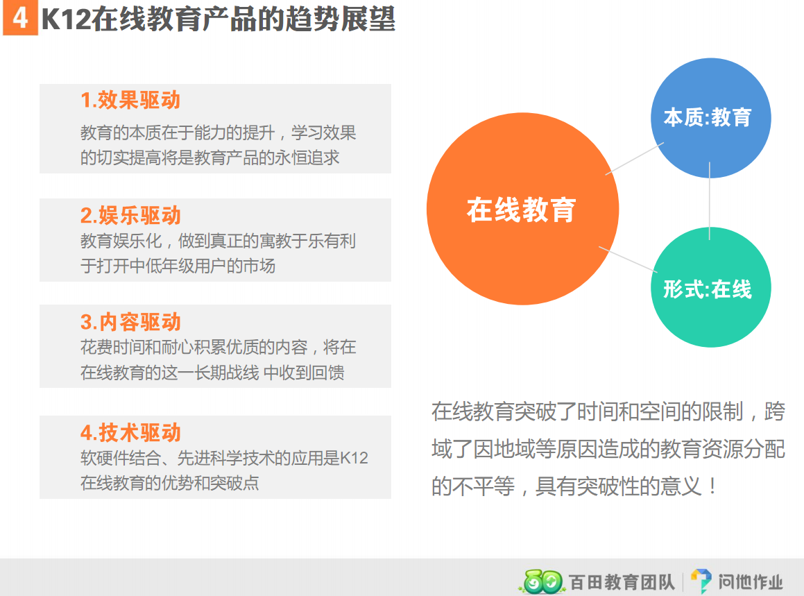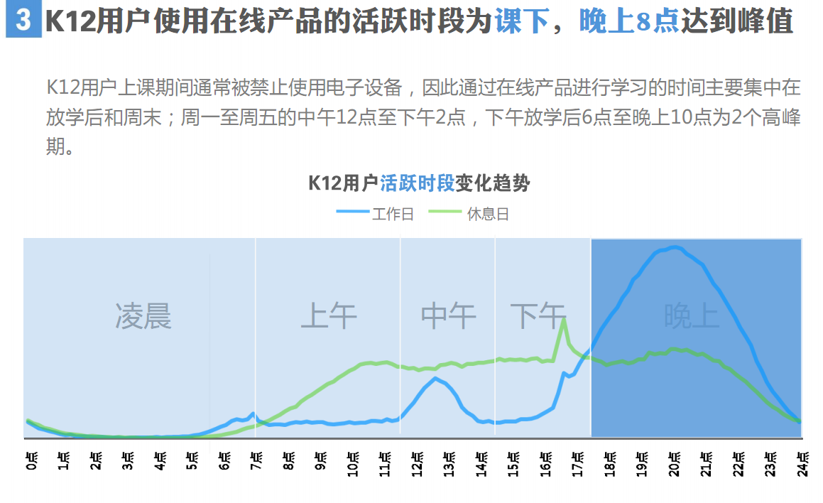 百田教育今日發(fā)布K12在線教育行業(yè)研究報告。報告顯示,K12移動在線教育產品的用戶中,初中生最多;用戶活躍度在晚上八點達到最高峰;用戶活躍時段在晚上八點達到最高峰值;K12用戶學習硬件以安卓智能手機為主,其中學習機占有一定比例。