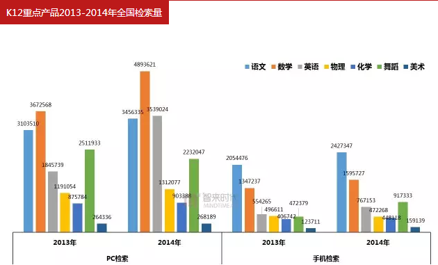 3, 從2013-2014年七個(gè)學(xué)科的檢索量來(lái)看,三大主科中語(yǔ)文和數(shù)學(xué)檢索量最大,英語(yǔ)所占份額雖然略小,但需求呈上升趨勢(shì)。理科中的物理和化學(xué)目前檢索量不高,但近兩年也在不斷上漲。藝術(shù)類(lèi)中舞蹈需求量遠(yuǎn)高于美術(shù),但2014年舞蹈的檢索量縮水,美術(shù)的則相對(duì)穩(wěn)定。教育培訓(xùn)機(jī)構(gòu)對(duì)不同學(xué)科產(chǎn)品的投入比重,應(yīng)綜合考慮學(xué)科需求的總量及變化趨勢(shì)。