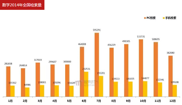 數(shù)學(xué)在三大主科中,近兩年一直是pc端檢索量第一,全年檢索量與學(xué)科橫向?qū)Ρ龋M(fèi)者對(duì)K12階段數(shù)學(xué)培訓(xùn)產(chǎn)品的需求持續(xù)最大。數(shù)學(xué)長(zhǎng)期是不少學(xué)生頭疼的學(xué)科,也是經(jīng)過(guò)培訓(xùn)提分較明顯的學(xué)科。2014年全年數(shù)學(xué)的檢索量都較高,尤其自暑假前夕的6月起,數(shù)學(xué)的檢索量一直保持在較高水平,7月達(dá)到全年檢索量頂峰,十分堅(jiān)挺,且全年關(guān)注幅度來(lái)看,數(shù)學(xué)學(xué)科檢索量月份之間的懸殊并不大。數(shù)學(xué)產(chǎn)品的檢索量在pc端和手機(jī)端差距較懸殊,pc端是明顯主力。