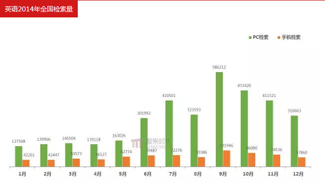 三大主科中的英語(yǔ),在小學(xué)階段的受重視程度不及語(yǔ)文和數(shù)學(xué),但是在2014年pc檢索量略超語(yǔ)文排在第二。近些年部分地區(qū)的中高考改革中,分值有所下降。英語(yǔ)在三大主科中的檢索量也相對(duì)較少。2014年,英語(yǔ)產(chǎn)品的全年檢索量整體幅度基本按月份呈現(xiàn)遞增關(guān)系。與語(yǔ)文和數(shù)學(xué)檢索量的最大值出現(xiàn)在暑假不同,英語(yǔ)的檢索量最大值出現(xiàn)在秋季學(xué)期的9月份,此時(shí)正值學(xué)生入學(xué)。秋季學(xué)期是英語(yǔ)檢索量的第一個(gè)黃金期,而一年內(nèi)的第二個(gè)黃金期則出現(xiàn)在暑假。PC端仍然是絕對(duì)優(yōu)先搜索渠道。