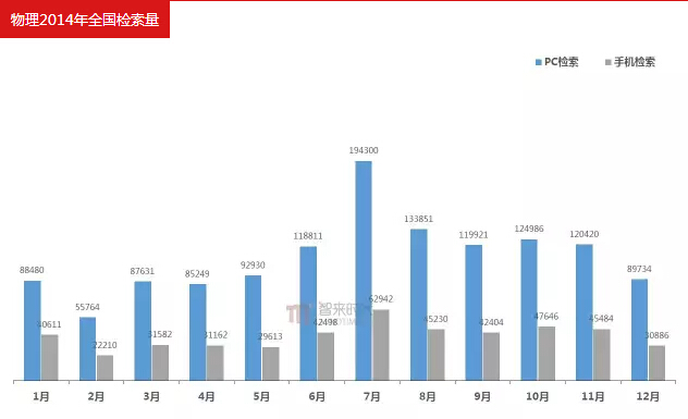 物理近兩年的檢索量在七個(gè)學(xué)科中一直徘徊于第五名。和數(shù)學(xué)學(xué)科一樣,物理學(xué)科2014年全年檢索量的最大值出現(xiàn)在7月份,暑假也是K12物理產(chǎn)品需求較大的時(shí)期。秋季學(xué)期的檢索量很平均,需求也穩(wěn)定。物理產(chǎn)品在春季學(xué)期的檢索量略低于秋季學(xué)期,2月份檢索量最低。pc端和手機(jī)端的檢索量差距較大,pc端依然占優(yōu)勢(shì)。
