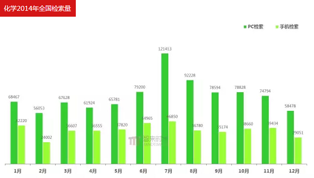 化學(xué)學(xué)科和物理學(xué)科在K12階段的地位差不多,化學(xué)產(chǎn)品在2014年的檢索量雖略少于物理,但變化趨勢(shì)與物理幾乎如出一轍。暑假也是化學(xué)課外培訓(xùn)的最熱時(shí)期,7月仍達(dá)到最高峰值。秋季學(xué)期的檢索量和春季學(xué)期的檢索量都相對(duì)穩(wěn)定,秋季略勝一籌。2月份也是一年中檢索量最低的時(shí)候。與物理檢索量不同的是,化學(xué)的檢索量雖也是pc端占多數(shù),但和手機(jī)端的差距相對(duì)較小。