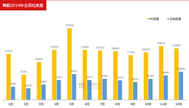 藝術(shù)類(lèi)科目中的舞蹈,檢索量在近兩年都較高,排在重點(diǎn)學(xué)科語(yǔ)數(shù)外后的第四名。舞蹈檢索量與其他文化課在2014年的變化趨勢(shì)有很大不同,除2月外的全年檢索量一直保持在較高水平,年檢索量的最大值出現(xiàn)在5月。藝術(shù)類(lèi)課程作為學(xué)生的課外興趣課程,其學(xué)習(xí)是一個(gè)長(zhǎng)期的過(guò)程,全年的需求量都較大。而高考藝考集中在12月和1月,這對(duì)秋季學(xué)期的高檢索量有一定影響。