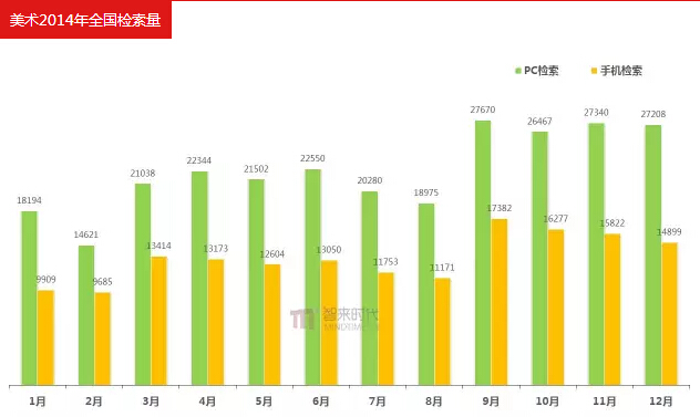 同為藝術(shù)類(lèi)科目的美術(shù),在2013-2014年的檢索量遠(yuǎn)不及舞蹈,在七個(gè)學(xué)科中排位最末。就其自身2014的全年檢索量來(lái)看,全年的檢索量大致呈階梯狀,分為三個(gè)區(qū)間:1月—2月,3月—8月,9月—12月,層層遞增,但不同區(qū)間的差距并不懸殊,可見(jiàn)全年的需求都較大且平均。與舞蹈相同,美術(shù)的高考藝考也集中在12月和1月,秋季學(xué)期也是美術(shù)產(chǎn)品檢索量最大的時(shí)期。