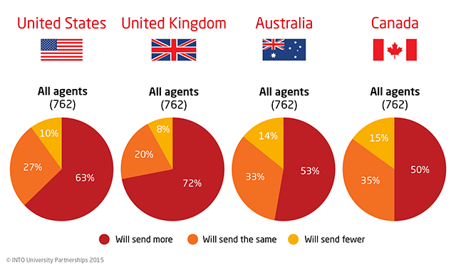 約三分之一的留學(xué)中介機(jī)構(gòu)表示,未來一年它們將向英國送去更多留學(xué)生;63%的機(jī)構(gòu)表示,未來一年他們將向美國送去更多的留學(xué)生。