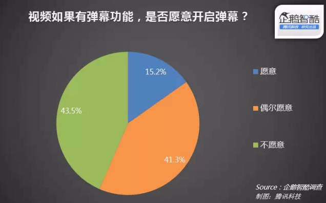 當(dāng)視頻網(wǎng)站有彈幕功能時,15.2%的用戶表示愿意開啟彈幕功能,41.3%的用戶偶爾愿意開啟。剩余43.5%的用戶則表示不愿開彈幕。