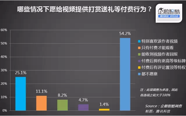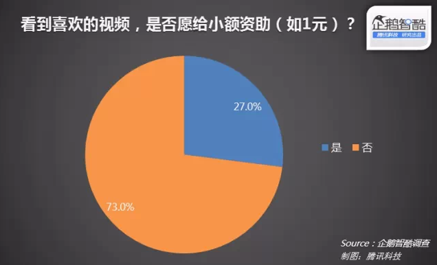 為了提升UGC視頻的創(chuàng)作和創(chuàng)新動力,部分視頻網(wǎng)站也在探索打賞等付費互動功能的發(fā)展?jié)摿ΑU{(diào)查中顯示,27%的用戶在看到喜歡或有價值的視頻時,愿意給予1元等小額資助。