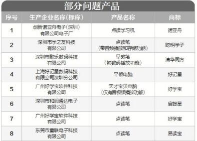 廣東省質(zhì)檢局公布手持式電子信息器具監(jiān)督抽檢情況,結(jié)果顯示不合格電子產(chǎn)品發(fā)現(xiàn)率為46.7%。其中,諾亞舟點讀學(xué)習(xí)機、清華同方早教筆、好記星平板電腦等14批次產(chǎn)品上榜。