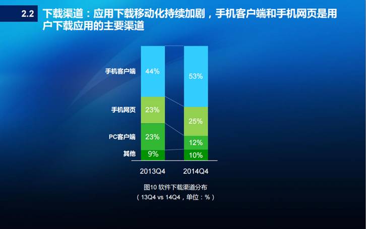 移動分發(fā)大盤增長迅速,在2014年實現同比增長36%;另一方面,用戶應用下載移動化持續(xù)加劇,手機客戶端和手機網頁成為用戶下載應用的主要渠道。兩個渠道在用戶應用下載中的占比分別從2013年Q4的44%和23%,提高到2014年Q4的53%和25%。
