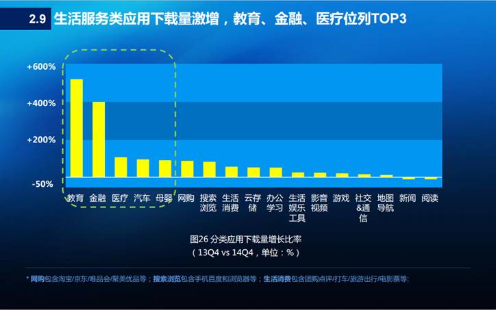 在17個垂類的APP中,新聞閱讀類應用下載量出現下跌,而教育、金融、醫(yī)療、汽車、母嬰這5大生活服務類應用下載量增長迅猛。