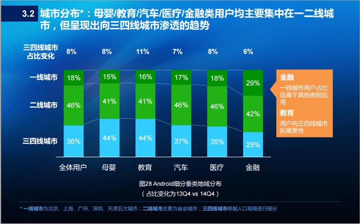 報告顯示,5類應用用戶均主要集中在一二線城市,呈現出向三四線城市滲透的趨勢,一二線城市用戶熱衷金融類應用,三四線城市用戶則更多下載母嬰類應用。