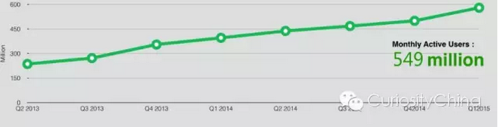 在2015年第一季度末,微信每月活躍用戶已達(dá)到5.49億(549million)。