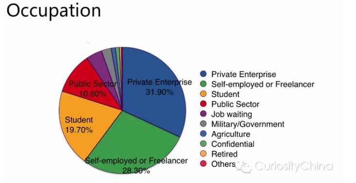 絕大部分微信用戶的職業(yè)來自:企業(yè)職員、自由職業(yè)者、學(xué)生、事業(yè)單位員工這四類職業(yè)。