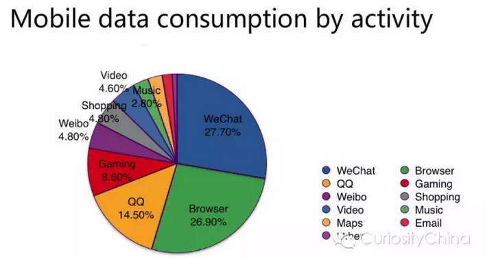 用戶在微信上的流量為所有應(yīng)用中的最高,遠(yuǎn)高于微博,購物,視頻,地圖,郵件等服務(wù)。
