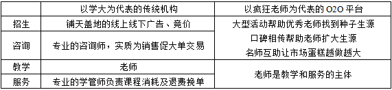 從本源上看,體制外的培訓(xùn)行業(yè)完成商業(yè)閉環(huán)究竟需要哪些環(huán)節(jié)?招生、咨詢、教學(xué)、服務(wù)這四大環(huán)節(jié)必不可少。我們來看一下傳統(tǒng)機(jī)構(gòu)和家教O2O平臺(tái)在這四大環(huán)節(jié)上分別是如何完成的。